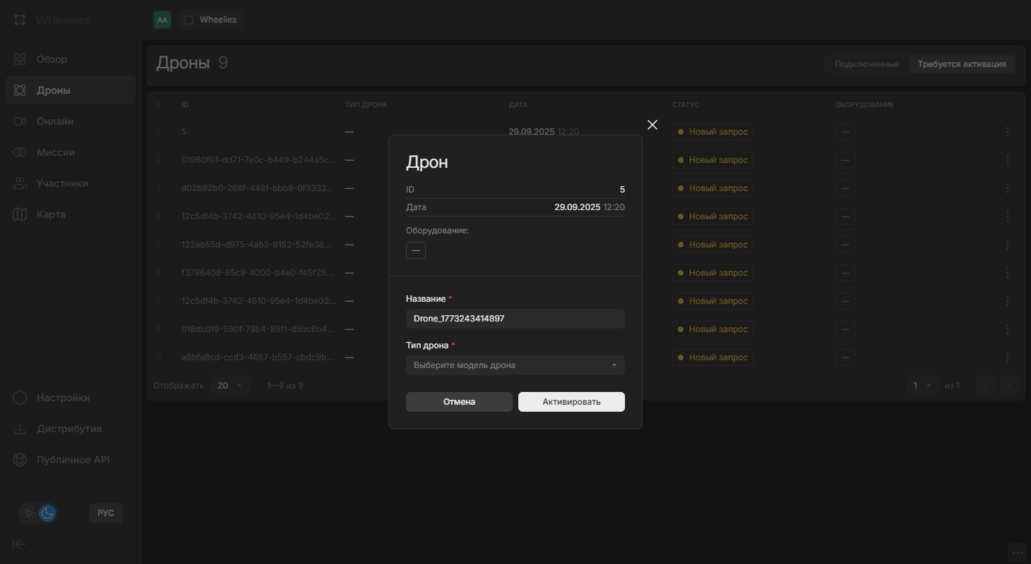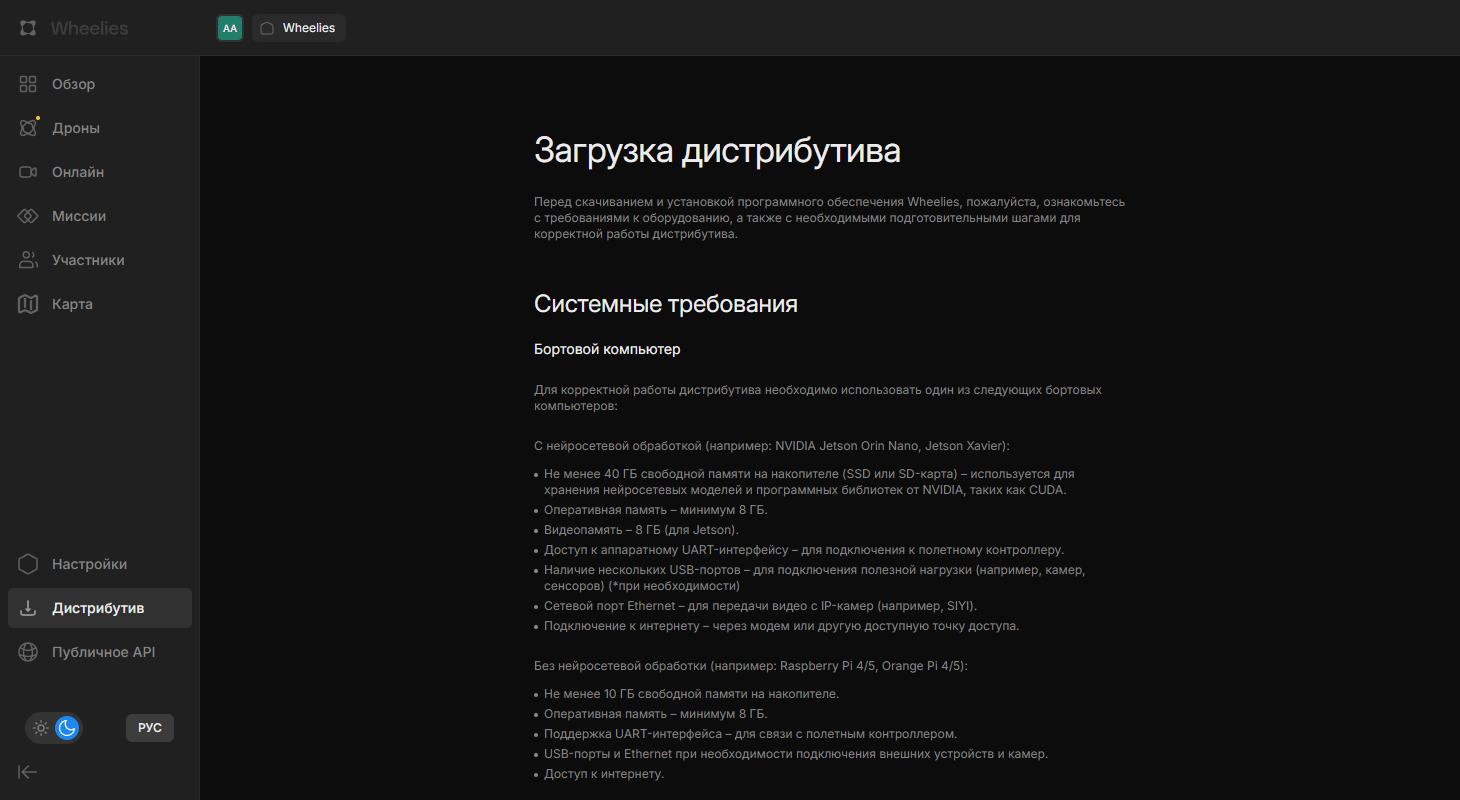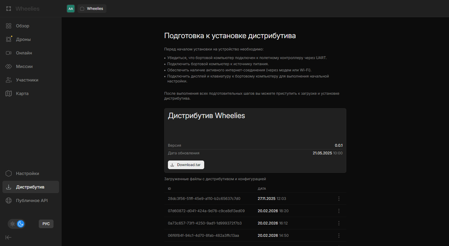 Для подключения нового дрона к платформе Wheelies необходимо загрузить дистрибутив, установить его на бортовой компьютер дрона, а затем активировать дрон через платформу.