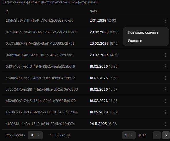 Нажмите кнопку «Download.tar» для скачивания дистрибутива. Файл привязан к вашей организации и содержит необходимые конфигурации.