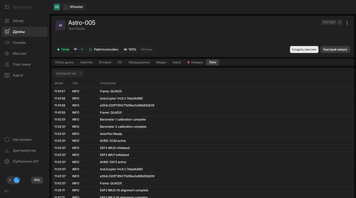 Вкладка «Логи» предоставляет доступ к системным логам дрона в реальном времени. Позволяет отслеживать работу бортового ПО и диагностировать проблемы.