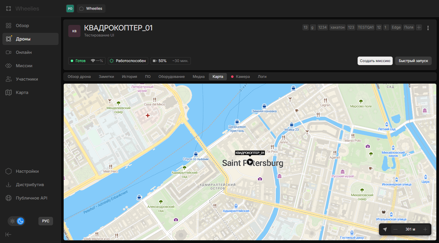 Вкладка «Карта» отображает текущее местоположение дрона на интерактивной карте. Доступна только для подключённых дронов.