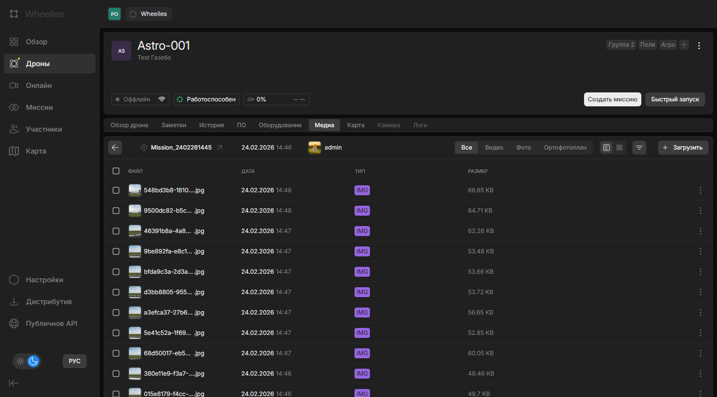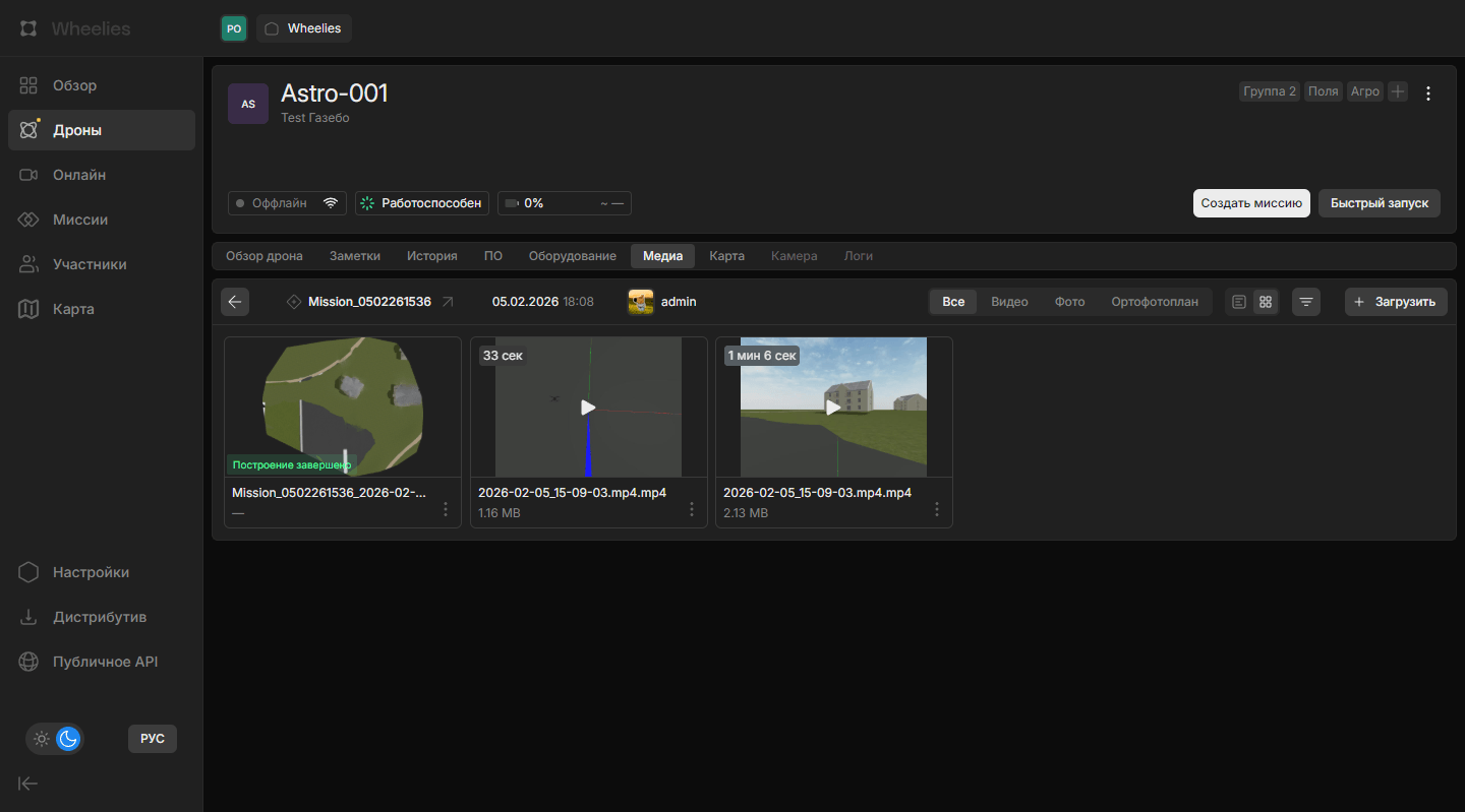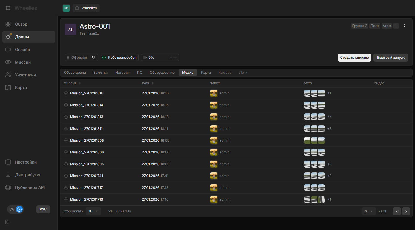 Вкладка «Медиа» содержит все фото и видео, снятые дроном. Медиафайлы группируются по миссиям для удобной навигации.