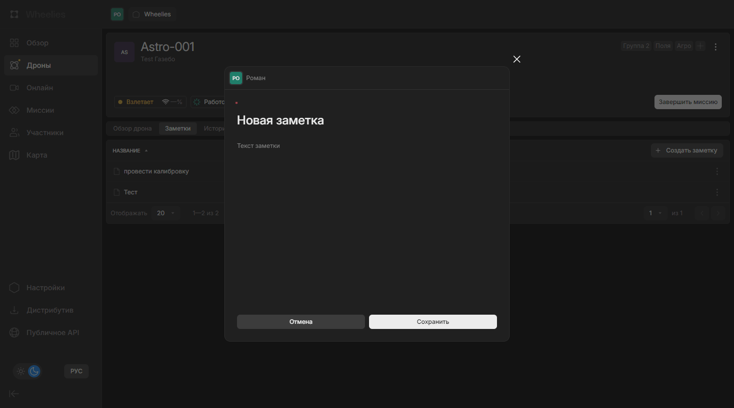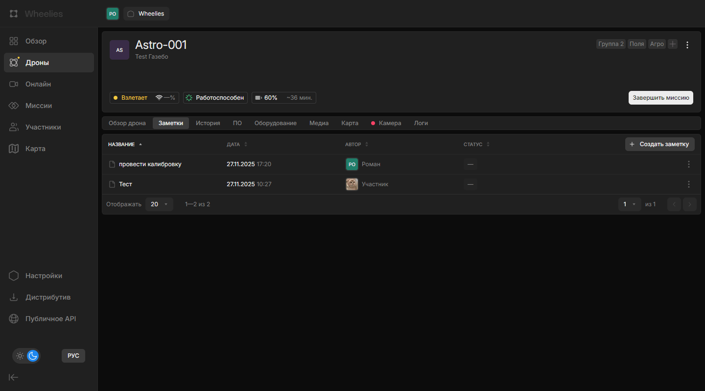 Вкладка «Заметки» предназначена для ведения записей по дрону. Она позволяет нескольким сотрудникам отслеживать изменения, фиксировать наблюдения и обмениваться информацией.