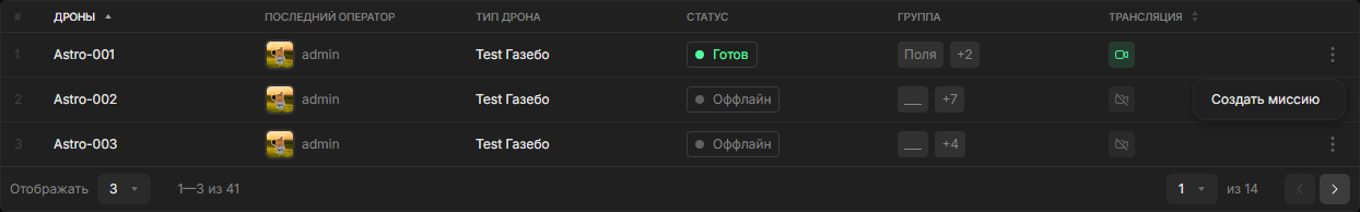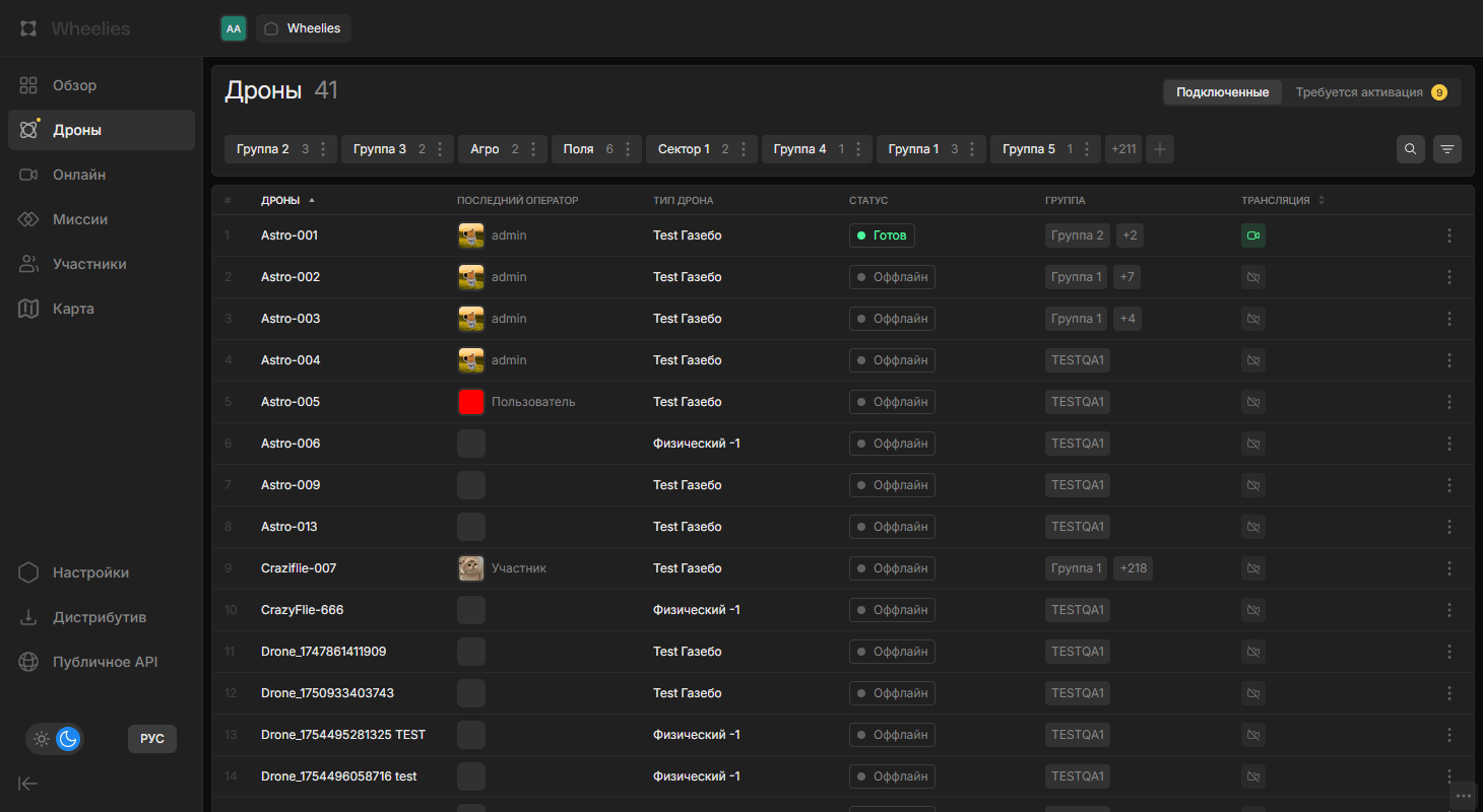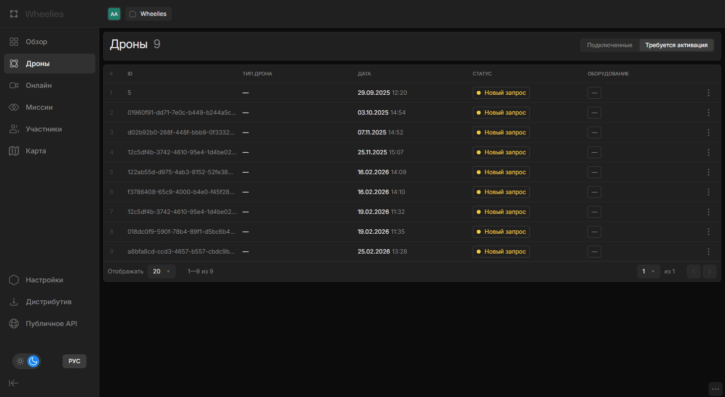 Раздел «Дроны» — центральное место управления всеми дронами организации. Здесь отображаются подключённые дроны, их статусы и запросы на активацию новых устройств.