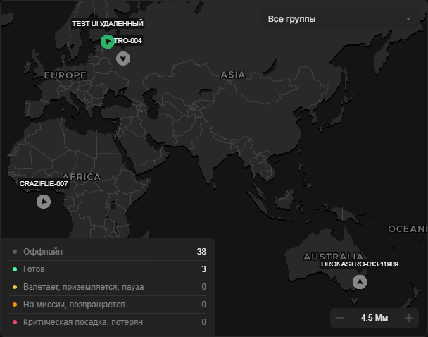 Под картой отображается легенда с количеством дронов в каждой группе. Щелкните на маркер дрона для приближения к его текущей позиции.