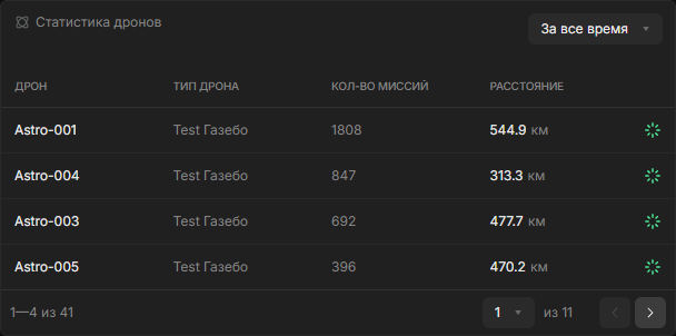 Таблица с показателями по каждому дрону за выбранный период (за всё время, за год, за месяц, за неделю, за день). Дроны отсортированы по количеству миссий.