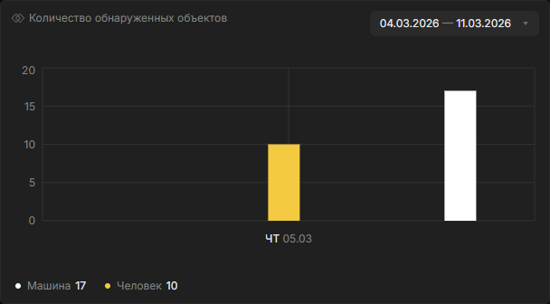 Столбчатая диаграмма с количеством объектов, обнаруженных дронами за выбранный период (по умолчанию — последние 7 дней). Столбцы группируются по дням и окрашены по типам обнаруженных объектов.