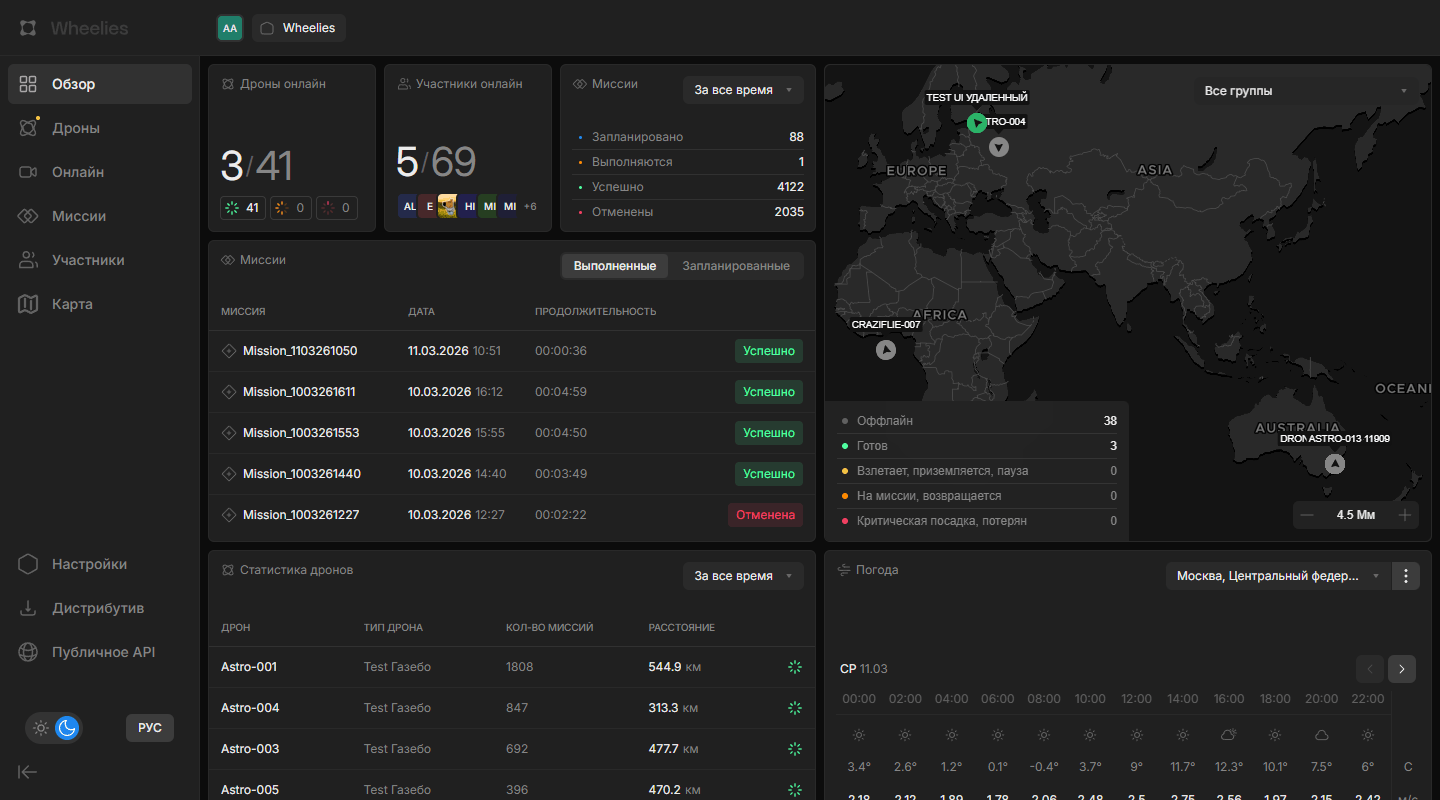 Главная страница платформы Wheelies является центральным дашбордом, предоставляющим сводную информацию о дронах, миссиях и общем состоянии системы. После авторизации пользователь попадает именно сюда.