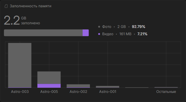 Виджет отображает общий объём занятого дискового пространства организации с разбивкой на фото и видео. В верхней части — общее значение и прогресс-бар, разделённый на два сегмента (фото — серый, видео — фиолетовый).
