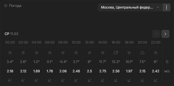 Виджет отображает почасовой прогноз погоды для выбранной локации. В таблице для каждого часа указаны: