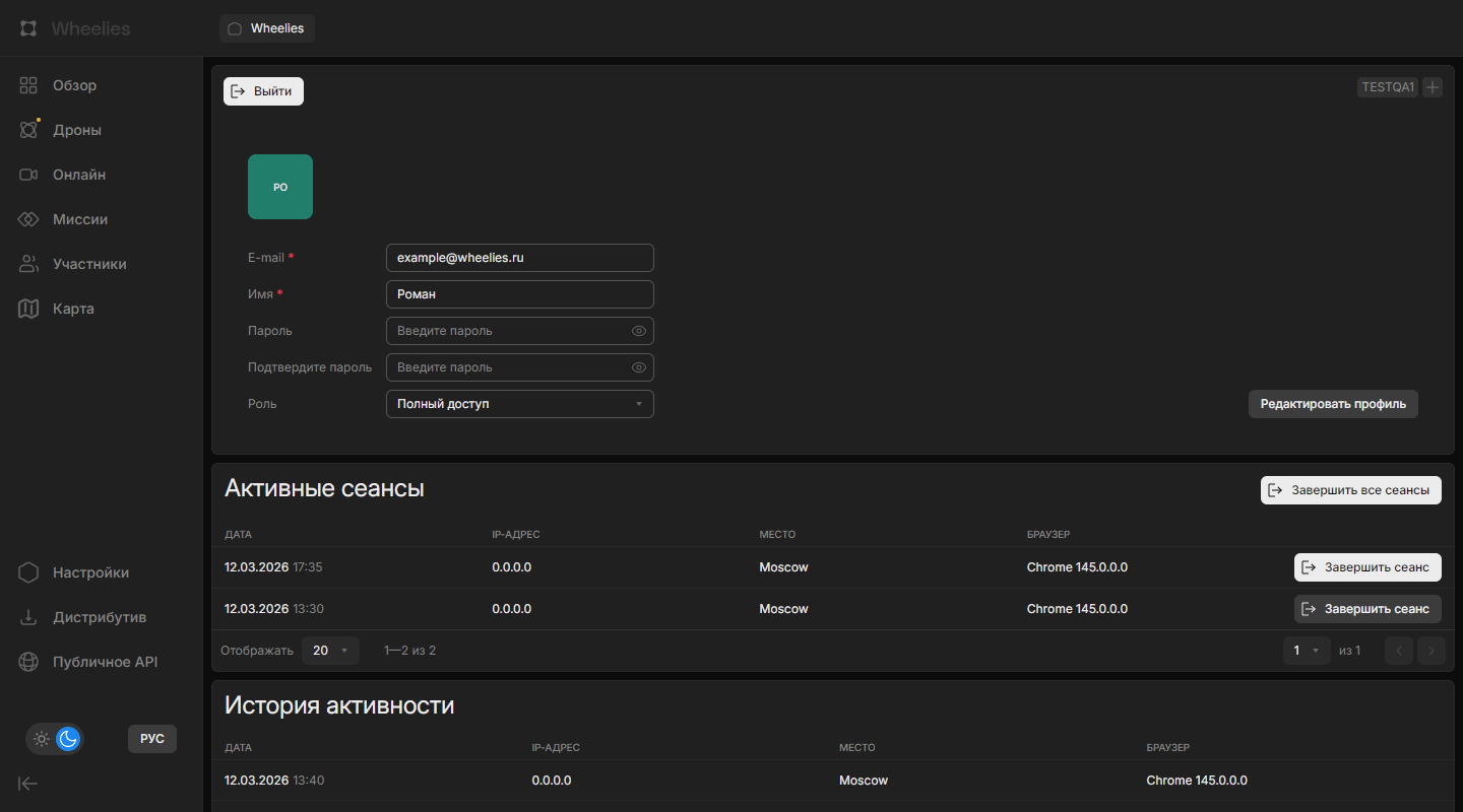 Страница «Профиль» содержит персональные настройки текущего пользователя, информацию о группах, активных сессиях и истории входов.