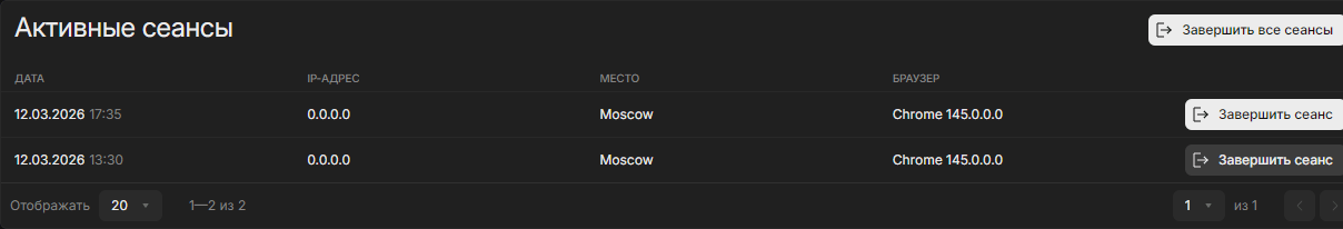 Список текущих активных сессий с возможностью завершения. Каждая сессия содержит информацию о браузере и устройстве.